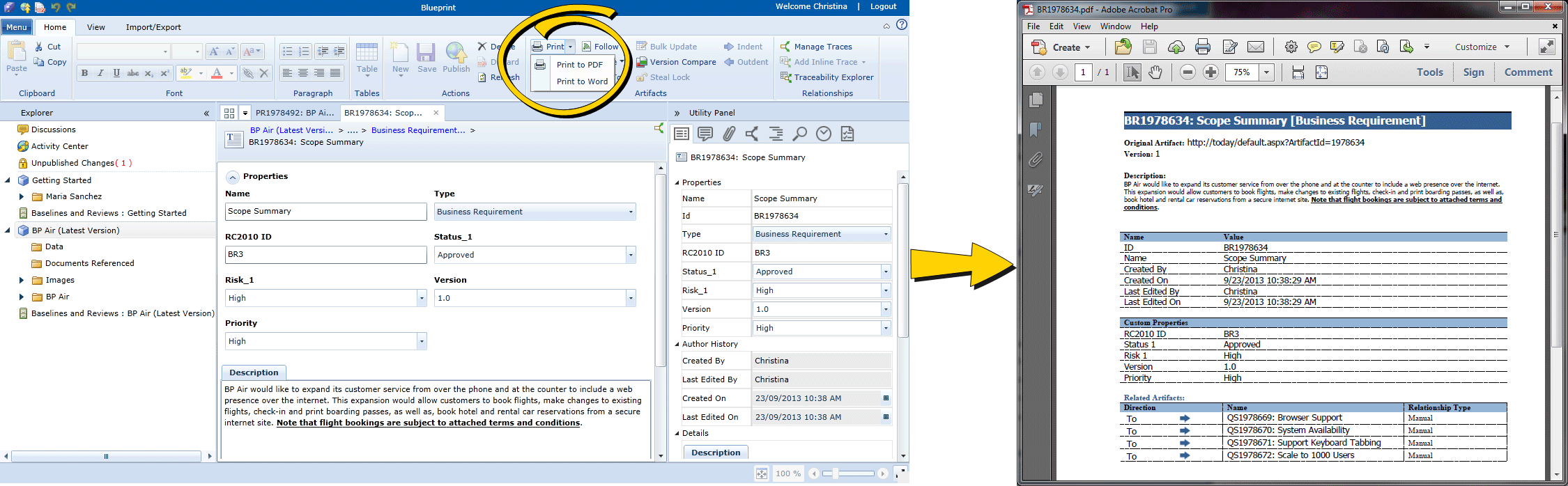 Blueprint allows you to efficiently print individual artifacts in Microsoft Word and PDF files. You can print the latest version of an artifact or choose a specific version to print.