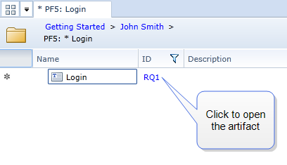 5. Open the Login textual requirement artifact. To open an artifact, click the artifact ID link in the artifact list.