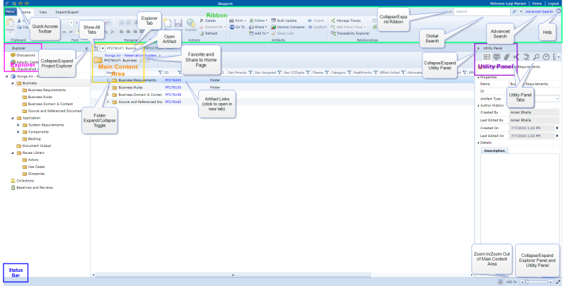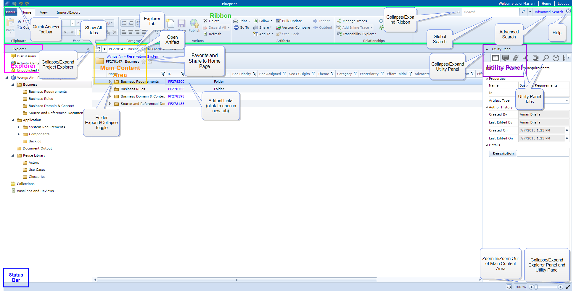 Blueprint's ribbon is designed to look and operate similar to the ribbon in Microsoft Office applications. You can use the ribbon to perform most tasks and operations in Blueprint. The ribbon always displays four tabs. A fifth tab, called the contextual tab, is sometimes displayed when you are viewing an artifact editor in the main content area, providing you with functions specific to that particular artifact editor. In addition to using the ribbon, you may want to try using the right-click context menu to improve your efficiency.
