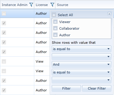 ClosedYou can narrow down your user list by clicking the filter iconnext to any of the column headers. The filter dialog box allows you to select the criteria you want to see in the list.